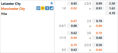 Trên sàn giao dịch châu Á lúc này Man City đang có tỷ lệ chấp 1 hòa, mức tỷ lệ không có gì bất thường so với những trận đấu tương tự trong quá khứ đối đầu gần đây. Tỷ lệ tài xỉu của trận đấu được công khai mức 2 3/4 cả trận. Điểm đáng chú ý là 5 trong 6 lần đối đầu gần nhất diễn ra trên sân Leicester kết thúc với nhiều nhất là 2 bàn thắng, có thể thấy mức tài xỉu của trận đấu này là tương đối cao.