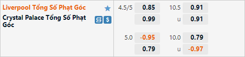 Tỷ lệ phạt góc của trận đấu được nhà cái duy trì ở mức 10 1/2 trận này, đây là mức tài xỉu phạt góc tương đối cao nếu so với mặt bằng chung của giải đấu. Nhưng theo thông kê đối đầu thì 2 cuộc chạm trán gần nhất đều kết thúc với kết quả xỉu phạt góc, 3 trận đấu gần nhất của Liverpool cũng không có quá 9 tình huống phạt góc được ghi nhận. Con số bên phía Palace là 4 trận đầu gần nhất. Với dự đoán trận đấu diễn ra sôi nổi thì nhiều khả năng kết quả phạt góc trận này cũng tương tự các trận đấu của hai đội thời gian gần đây.