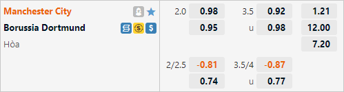 Với lối chơi cởi mở của Dortmund và sự vượt trội của Man City trận này thì có lẽ lựa chọn cửa tài là một lựa chọn hợp lý. Khả năng Man City có một trận thắng thuyết phục là rất cao nhưng Dortmund cũng không phải là không có cơ hội ghi bàn vào lưới đối phương.