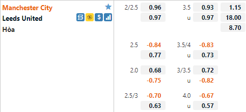 Với lợi thế sân nhà và đẳng cấp vượt trội Man City đang có tỷ lệ chấp 2 1/4 trên sàn giao dịch châu Á. Đây là mức chấp cao của đội chủ nhà, ở trận đấu tương tự của mùa giải trước Man City chỉ có tỷ lệ chấp 1 1/2 và Leeds còn tạo nên bất ngờ trận đấu đó khi giành chiến thắng 2-1.