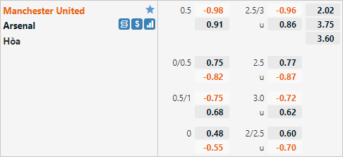 Với lợi thế sân nhà Man Utd đang được nhà cái châu Á đánh giá ở vị trí cửa trên với tỷ lệ chấp 1/2 trận này. Đây cũng là mức chấp của Man Utd trong trận đấu tương tự của mùa giải trước. Điểm đáng chú ý là Man Utd thua kèo châu Á trong 5 lần tiếp đón Arsenal gần nhất.