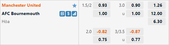Với lợi thế sân nhà và đẳng cấp vượt trội các cầu thủ Man Utd đang được nhà cái đánh giá ở cửa trên với tỷ lệ chấp 1 3/4 trận này. Trận đấu tương tự gần nhất diễn ra năm 2020 các cầu thủ Man Utd cũng có tỷ lệ chấp tượng tự và đã dễ dàng giành chiến thắng với tỷ số 5-2. Điểm đáng chú ý là Man Utd đã thắng kèo cả 2 lần tiếp đón Bournemouth gần nhất.