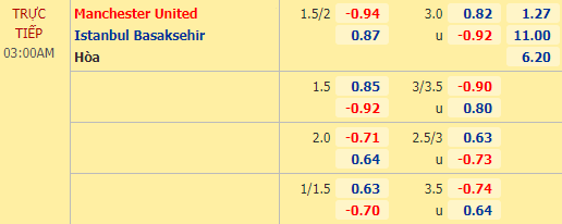 Dù handicap MU chấp tới 1 3/4 nhưng tài xỉu lại không quá cao, chỉ là 3 hòa, điều này không hứa hẹn về kịch bản cởi mở. Istanbul BB bị đánh giá thấp hơn nhiều, lại phải chơi trên sân khách nên khả năng họ sẽ chủ động tử thủ chờ cơ hội phản công. Tuyến trên của MU chưa mang đến sự yên tâm khi trận hay trận dở.