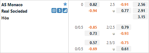 Mặc dù có lợi thế sân nhà nhưng Monaco trận này chỉ được nhà cái châu Á đánh giá nhỉnh hơn đối thủ đôi chút với tỷ lệ 0:0 và mức điểm ăn ít. Đây là mức tỷ lệ hợp lý khi Sociedad có tỷ lệ chấp 1/2 khi tiếp đón Monaco ở trận đấu lượt đi, ở trận đấu đó đội bóng Pháp có một kết quả tốt khi cầm hoà đối thủ với tỷ số 1-1