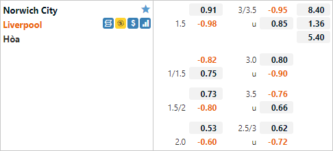 Trên sàn giao dịch châu Á hiện tại Liverpool được nhà cái đưa ra tỷ lệ chấp 1 1/2 cho trận đấu này, tỷ lệ chấp không có nhiều thay đối so với lần gần nhất Liverpool làm khách của Norwich. Mốc tài xỉu của trận đấu được công khai ở mức 3 1/4, có thể thấy giới cầm cân nảy mức tin tưởng vào khả năng trận đấu sẽ diễn ra sôi nổi khi đưa mức tài xỉu tương đối cao này.