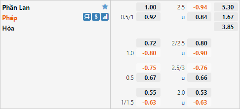 Nhà cái châu Á đang đánh giá ĐT Pháp cao hơn với tỷ lệ chấp 3/4 và mức điểm ăn ít trận đấu này. Đây có thể coi là tỷ lệ chấp tương đối thấp của đội khách khi họ có tỷ lệ chấp tới 1 3/4 trong trận đấu lượt đi. Nhưng điều này hoàn toàn dễ hiểu khi Phần Lan mới là đội có động lực thi đấu trận này.