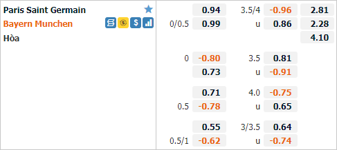 Thất bại 2-3 trước PSG ngay trên sân nhà trận lượt đi là một kết quả tệ hại của Hùm Xám tuần trước. Với kết quả này Bayern Munich cần thắng với 2 bàn cách biệt để vượt qua đối thủ. Trên sàn giao dịch châu Á hiện tại, mặc dù phải thi đấu trên sân khách nhưng Bayern Munich vẫn được đánh giá cao hơn với tỷ lệ chấp 1/4.