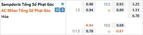 2 trong 3 trận đấu gần nhất diễn ra trong tháng 7 và 8 của Sampdoria đều có không ít hơn 10 tình huống phạt góc. Với dự đoán trận đấu không diễn ra sôi nổi thì khả năng có nhiều tình huống phạt góc vẫn có thể xảy ra, bởi khi hai đội gặp khó khăn trong việc tiếp cận khung thành đối phương thì các phương án treo bóng từ hai cánh hoặc dứt điểm từ xa sẽ được lựa chọn.
