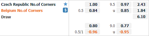 Tỷ lệ tài xỉu phạt góc của trận đấu đang được nhà cái công khai ở mức 9 1/2, đây là mức tỷ lệ tương đồng với mặt bằng chung của giải đấu. Những trận đấu gần đây của ĐT không có nhiều tình huống phạt góc. Cụ thể là chỉ có 1 trong 3 trận đấu gần nhất của họ có nhiều hơn 9 tình huống phạt góc, 4 trận đấu gần nhất của ĐT Bỉ cũng có kết quả tương tự. Điều này cho thấy lối chơi tấn công của hai đội đều không phụ thuộc nhiều vào những tình huống tấn công biên, có lẽ lựa chọn ít tính huống phạt góc sẽ là một lựa chọn an toàn.