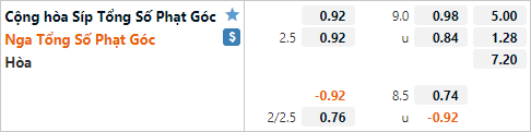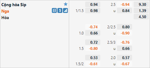 Trên sàn giao dịch châu Á ĐT Nga được nhà cái đánh giá cao hơn với tỷ lệ chấp 1 1/4 cho trận đấu này. Ở trận đấu tương tự gần nhất trong khuôn khổ vòng loại Euro diễn ra năm 2019 ĐT Nga cũng đã có tỷ lệ chấp 1 1/4 và họ không cho Síp có cơ hội nào với chiến thắng thuyết phục 5-0. Tỷ lệ tài xỉu của trận đấu được công khai ở mức 2 1/2 và điểm ăn ít bên phía cửa xỉu.
