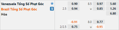 Ở phía bên kia những thống kê của Venezuela cũng tương tự, với dự đoán Brazil hoàn toàn làm chủ thế trận thì khả năng có nhiều tình huống phạt góc hay không phụ thuộc phấn lớn vào lối chơi của Brazil. Có thể thấy đội khách khó có thể lựa chọn lối chơi treo bóng từ hai cánh ngay cả khi họ bế tắc trong tấn công bởi Brazil hiện tại không sở hữu nhiều cầu thủ có thể hình vượt trội. Lựa chọn xỉu phạt góc vẫn là một lựa chọn tốt.