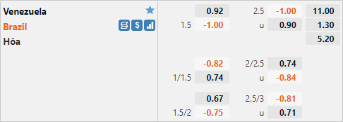 Ở phía bên kia Venezuela không có phong độ tốt ở thời điểm hiện tại và thực tế lực lượng của họ cũng không thể so sánh với đội khách. Có lẽ mục tiêu đội chủ nhà hướng tới trận đấu này sẽ là hạn chế Brazil bàn, hoặc may mắn hơn có thể giữ lại 1 điểm trên sân nhà. Với những dự đoán trên thì có lẽ lựa chọn cửa xỉu sẽ là lựa chọn hợp lý cho trận đấu này.