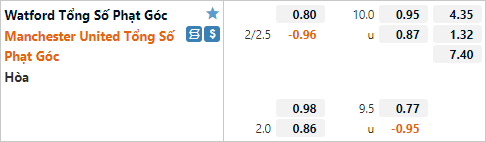 Mức tỷ lệ tài xỉu phạt góc của trận đấu đang được duy trì ở mức 10 hoà. Có thể thấy đây là mức tài xỉu tương đối cao khi 3/4 cuộc đối đầu gần nhất của hai đội đều chỉ ghi nhận 8 tình huống phạt góc 1 trận. Man Utd cũng không có nhiều phạt góc những trận đấu gần đây (3 trận gần nhất Quỷ đỏ chỉ có 1 tình huống phạt góc 1 trận). Nhưng với việc nhà cái vẫn đưa ra mức tài xỉu cao và dự đoán Watford sẽ chủ động chơi chặt chẽ trận này thì lựa chọn cửa tài chưa chắc đã là một lựa chọn mạo hiểm.