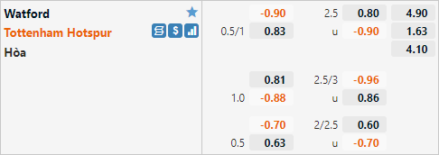 Với lực lượng vượt trội so với đối thủ Tottenham đang được nhà cái đánh giá ở cửa trên với tỷ lệ chấp 3/4 và mức điểm ăn ít trên sàng giao dịch châu Á. Đây là mức tỷ lệ chấp tương đối cao, ở trận đấu tương tự gần nhất tại giải Ngoại hạng Anh Tottenham chỉ có tỷ lệ chấp 1/4. Điều này cũng dễ hiểu khi Tottenham đang duy trì được sử ổn định trong khi Watford đang trải qua 1 giai đoạn khó khăn.