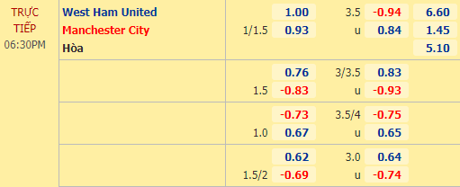 Mùa này, những trận cầu của Man xanh đã không còn quá bùng nổ về số bàn thắng. 2 vòng mới nhất của Man City đều khép lại với không quá 2 lần lưới rung. Nhưng với việc nhà cái vẫn đưa ra tài xỉu lên tới 3 1/2 cho trận này thì kịch bản cởi mở lại được AEGoal đánh giá cao. West Ham chơi tấn công không tệ, 3 bàn vào lưới Leicester cũng như Tottenham mới đây là minh chứng rõ ràng cho khả năng khoan phá của The Hammers.