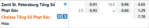 Tỷ lệ tài xỉu phạt góc của trận đấu được công khai ở mức 10 hoà đây là mức tương đồng với mặt bằng chung của các trận Champions League hôm nay. 4 trận đấu gần nhất của Zenit đều không có quá 8 tình huống phạt góc được ghi nhận, 2 trận đấu gần nhất của Chelsea cũng có kết quả tương tự. Với dự đoán trận đấu sẽ diễn ra sôi nổi thì nhiều khả năng trận đấu này cũng khó có nhiều tình huống phạt góc, do hai đội đều không gặp nhiều khó khăn trong việc tiếp cận khung thành đối phương.