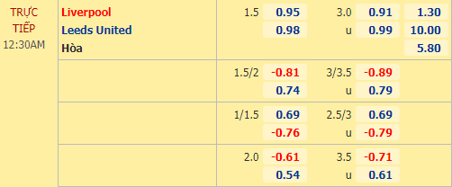 AEGoal soi kèo tổng bàn thắng và kèo hiệp 1 trận đấu giữa Liverpool vs Leeds Utd diễn ra lúc 23h30 ngày 12/09 trong khuôn khổ vòng 1 giải Ngoại hạng Anh.