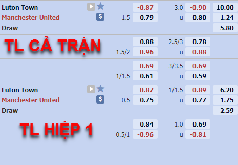 Manchester United đang có tỷ lệ chấp 1 3/4 và mức điểm ăn cân bằng trên sàn giao dịch vào thời điểm này. Đây là mức tương đối cao của đội khách khi họ không có được phong độ ổn định thời điểm này, trong khi Luton Town lại có phong độ cực kỳ ấn tượng với 8 trận thắng kèo liên tiếp. Tỷ lệ hiệp 1 trận đấu đang được công khai ở mức chấp 3/4 và điểm ăn bỏ của các cầu thủ Manchester United, đây là mức tỷ lệ chấp hợp lý khi đội khách có tỷ lệ chấp sâu cả trận.