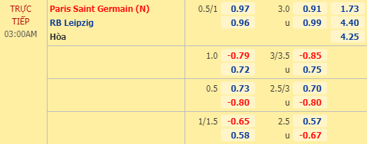 Kèo hiệp 1 PSG chấp đồng banh với điểm ăn tương đối cân bằng cho 2 cửa, đây chưa hẳn là tỷ lệ khả quan dành cho PSG trong hiệp 1 bởi dẫu sao thì họ cũng được đánh giá cao hơn nhiều so với đối thủ. Nên nhớ trận cầu với Atalanta vừa qua, PSG còn bị dẫn trước ở hiệp đấu đầu tiên. Với mức tỷ lệ HT như vậy thì nên tin vào RB Leipzig ở hiệp 1 trận này.