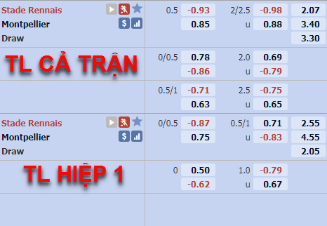 Với lợi thế sân nhà và lực lượng nhỉnh hơn đối thủ đối chút Rennes đang có tỷ lệ chấp 1/2 trên sàn giao dịch châu Á ở thời điểm hiện tại. Ở kèo hiệp 1 của trận đấu đội chủ nhà có tỷ lệ chấp 1/4 và mức điểm ăn bỏ. Ở trận đấu tương tự của mùa giải trước Rennes đã dễ dàng thắng kèo hiệp 1 với 2 bàn thăng dẫn trước khi kết thúc hiệp đầu đầu tiên. Rennes đang có thành tích đối đầu tốt trước Montpellier khi họ thắng kèo hiệp 1 cả 2 trận đối đầu của mùa giải trước.