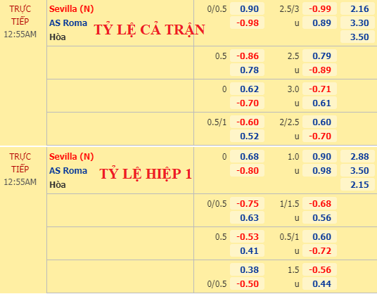 Soi kèo Tài-Xỉu và hiệp 1 trận Sevilla vs AS Roma (23h55)