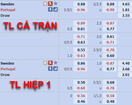 Thuỵ Điển đang chiếm ưu thế trong quá khứ đối đầu khi chỉ thua kèo hiệp 1 đúng 1 lần sau tổng cộng 6 cuộc đối đầu gần nhất. Với phong độ gần đây Thuỵ Điển lại không có thành tích tốt sau 45 phút đầu tiên, họ thua kèo hiệp 1 cả 4 trận đấu gần nhất. Ở phía bên kia Bồ Đào Nhà cũng không có thành tích tốt hơn là mấy khi thắng kèo 1 trận sau 6 trận đấu gần nhất.