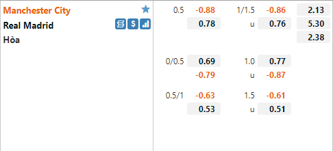 Ở trận đấu này Man City được giới chuyên môn đánh giá rất cao với tỷ lệ chấp 1 hoà và điểm ăn thấp. Ở lần đón tiếp Real Madrid gần nhất các cầu thủ Man City cũng có tỷ lệ chấp tương tự và họ đã không thể vượt kèo khi chỉ có chiến thắng 2-1.
