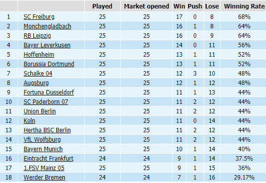 Đứng đầu trên BXH về tỷ lệ của Bundesliga tính cho đến thời điểm hiện tại là cái tên khá bất ngờ - Freiburg. CLB này chỉ đứng thứ 8 về điểm số nhưng lại sở hữu tỷ lệ thắng kèo cao nhất giải. Điều đó cho thấy Freiburg đã chơi thành công trên mức chờ đợi của giới mộ điệu. Sau 25 trận đã đấu, Freiburg có 17 lần vượt qua rào cản tỷ lệ, và chỉ 8 lần họ khiến nhà đầu tư phải thất vọng.