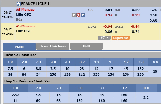 Vào thời điểm công bố tỷ lệ châu Á, các nhà cái niêm yết kèo chính Monaco chấp 1 3/4. Đây là điều dễ hiểu khi đội chủ nhà đang là đương kim giữ Cúp, trong khi bên kia chiến tuyến là Lille chỉ xếp áp chót bảng điểm. Khoảng cách quá lớn giữa 2 đội được thể hiện rất rõ ràng qua mức chênh lệch lên tới 55 điểm với ưu thế nghiêng về Monaco.
