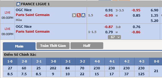 Tổng bàn thắng cả trận: Đây là cuộc gặp gỡ giữa 2 đội có lối chơi tấn công đặc trưng tại môi trường bóng đá Pháp. Nice đang có phong độ cao trên hàng công với 7 bàn sau 2 vòng gần nhất. Trong khi đó, PSG sở hữu nhiều nhân tố chất lượng như Di Maria, Cavani hay tiền đạo trẻ đang lên Nkunku là những lý do để hy vọng vào cơn mưa bàn thắng ở trận đấu này. Chọn Trên 3 1/4 bàn cả trận.
