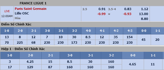 Hiệp 1: Theo thống kê ở 11 trận sân nhà gần nhất, có đến 7 trận đấu PSG ghi từ 2 bàn trở lên ngay trong Hiệp 1 Vậy nên trước 1 Lille vốn có một hàng phòng ngự khá “dễ dãi”, việc nhà cái ra kèo PSG chấp 1 1/4 và Tài/Xỉu 1 3/4 trong Hiệp 1 có lẽ cũng chưa đủ làm nản lòng người chơi đặt niềm tin vào PSG. Kịch bản về một cơn thịnh nộ của chú mãnh hổ PSG đang bị tổn thương sau 2 trận thua liên tiếp có thể sẽ được biến thành những bàn thắng ngay trong 45 phút đầu tiên. Chọn PSG hiệp 1.