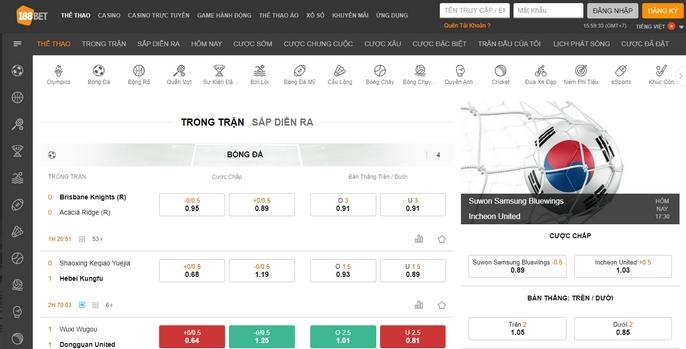 Xuất hiện trên thị trường vào năm 2006, cho đến nay người chơi vẫn vô cùng hài lòng với dịch vụ và chất lượng sản phẩm tại nhà cái 188Bet. Sảnh cá cược bóng đá không chỉ đa dạng kèo cược, tỷ lệ cược cũng vô cùng hấp dẫn. Người chơi vừa theo dõi trực tiếp trận bóng, vừa đặt cược rung theo bảng kèo của nhà cái. Hệ thống bảng tỷ lệ kèo được cập nhật realtime, nhanh chóng theo tình hình diễn biến của trận đấu sắc nét, đường truyền nhanh, không làm ảnh hưởng đến quá trình cược của thành viên.