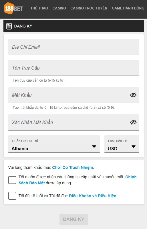 Sau khi truy cập vào trang chủ 188bet, tại đây nếu người chơi chưa có tài khoản chính thức, vui lòng nhấp vào ô “ đăng ký” sau đó thực hiện theo hướng dẫn nhân viên dịch vụ. Các thông tin người chơi cung cấp cho nhà cái phải đảm bảo chính xác, không sử dụng đăng ký trước đó.