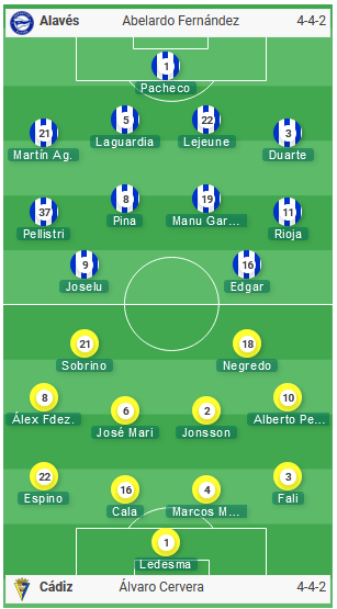 ALAVES: Pacheco, Martín, Laguardia, Lejeune, Duarte, Pellistri, Pina, Manu, Luis Rioja, Joselu, Edgar.