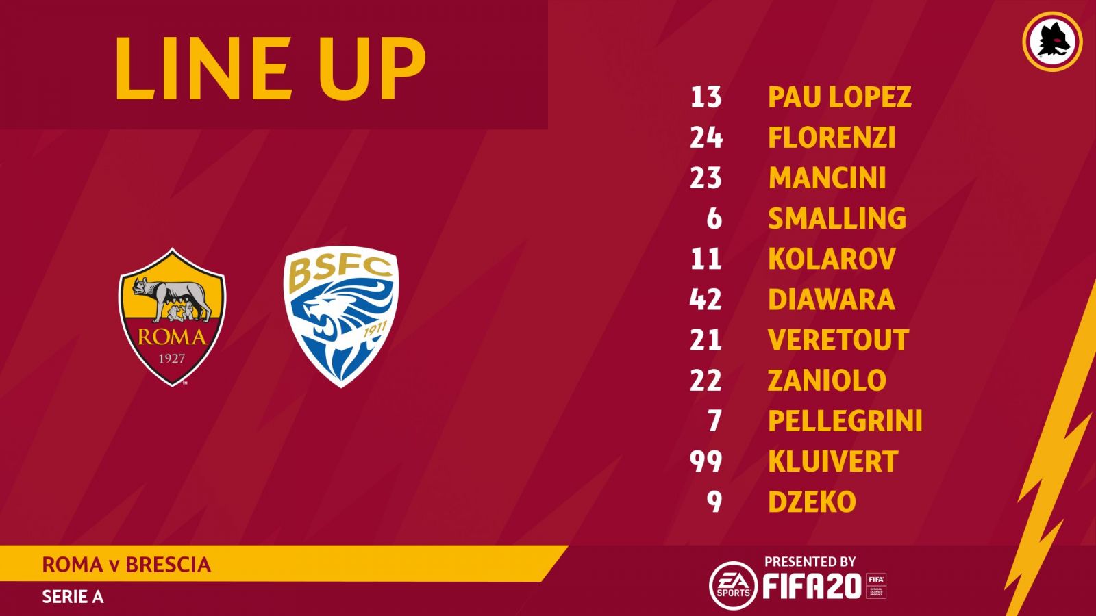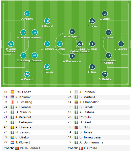 Roma: Pau Lopez; Florenzi, Mancini, Smalling, Kolarov; Diawara, Veretout; Zaniolo, Pellegrini, Kluivert; Dzeko