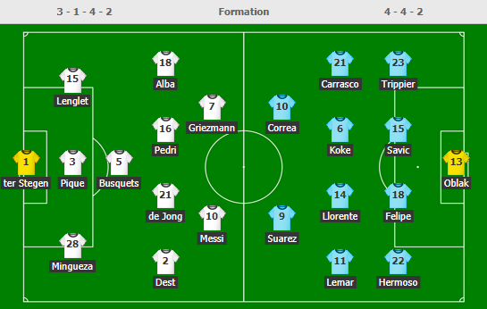 Barcelona: Marc-Andre ter Stegen, Araujo, Pique, Lenglet, Sergi Busquets,Dest, De Jong, Pedro, Jordi Alba, Messi, Griezmann
