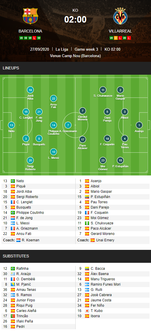 AEGoal.net cập nhật chính xác ĐỘI HÌNH RA SÂN trận Barcelona vs Villarreal diễn ra lúc 02h00 ngày 28/9 trong khuôn khổ Vòng 3 - VĐQG Tây Ban Nha.