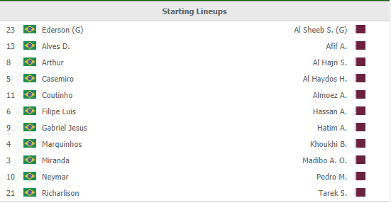 AEGoal.net cập nhật chính xác ĐỘI HÌNH RA SÂN trận Brazil vs Qatar diễn ra lúc 07h30 ngày 06/6 trong khuôn khổ Giao hữu Quốc tế.