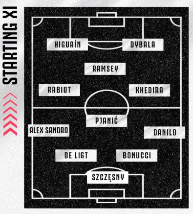 Juventus (4-3-3): Szczesny - Danilo, Demiral, de Ligt, Sandro - Rabiot, Pjanic, Matuidi - Bernardeschi, Higuain, Dybala