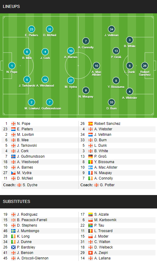 AEGoal cập nhật chính xác ĐỘI HÌNH RA SÂN trận Burnley vs Brighton diễn ra lúc 22h00 ngày 06/02 trong khuôn khổ giải Ngoại hạng Anh.
