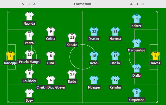 - PSG: Navas; Florenzi, Marquinhos, Kimpembe, Kurzawa; Gueye, Paredes; Kean, Verratti, Mbappe; Icardi.