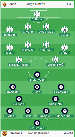 Barcelona: Ter Stegen; Mingueza, Araujo, Umtiti, Jordi Alba; Busquets, De Jong, Pedri; Dembélé, Braithwaite, Griezmann.