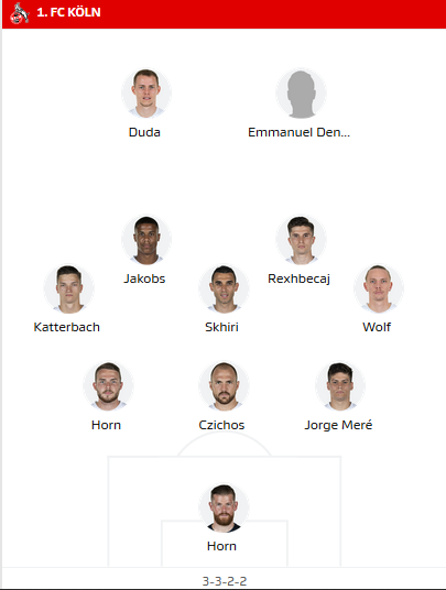 FC Koln (3-4-1-1-): T. Horn - Mere, Bornauw, Czichos - Wolf, Skhiri, Meyer, Hector (c), J. Horn - Duda - Dennis