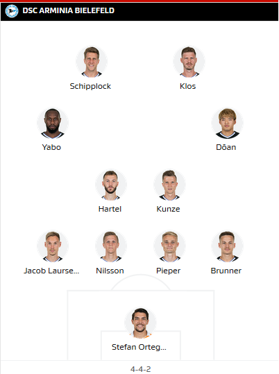 Bielefeld (4-1-3-2): Ortega - Brunner, Pieper, Nilsson, Laursen - Kunze - Doan, Hartel, Yabo - Klos (c), Cordova