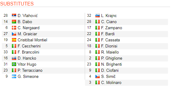 Fiorentina (4-3-3): Lafont - Biraghi, Hugo, Pezzella, Milenkovic - Benassi, Veretout, Gerson - Muriel, Simeone, Chiesa
