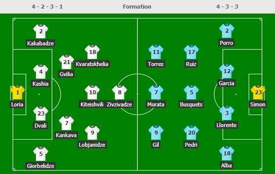 AEGoal cập nhật chính xác ĐỘI HÌNH RA SÂN trận Georgia vs Tây Ban Nha diễn ra lúc 23h00 ngày 28/03 trong khuôn khổ Vòng loại World Cup 2022 khu vực châu Âu.