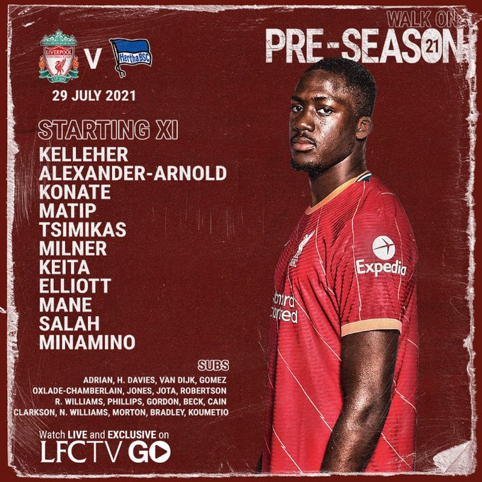 - Liverpool: Kelleher; Williams, Konate, Phillips, Tsimikas; Milner, Keita, Oxlade-Chamberlain; Elliott, Salah, Jota