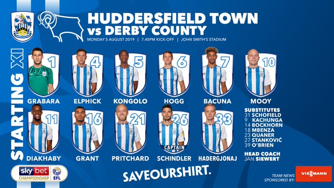 Huddersfield (4-3-3): Grabara - Bockhorn, Kongolo, Schindler, Hadergjonaj - Bacuna, Mooy, Hogg - Diakhaby, Grant, Mbenza