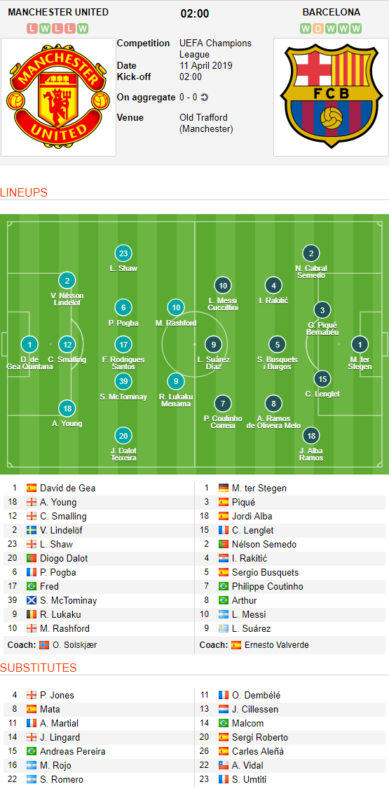 AEGoal.net cập nhật chính xác ĐỘI HÌNH RA SÂN trận Man Utd vs Barcelona diễn ra lúc 02h00 ngày 11/4 trong khuôn khổ Lượt đi Tứ kết – UEFA Champions League.