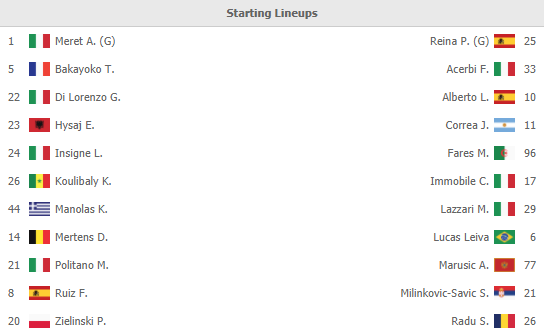 Napoli: Meret; Di Lorenzo, Manolas, Koulibaly, Rui; Bakayoko, Ruiz; Politano, Zielinski, Insigne; Mertens